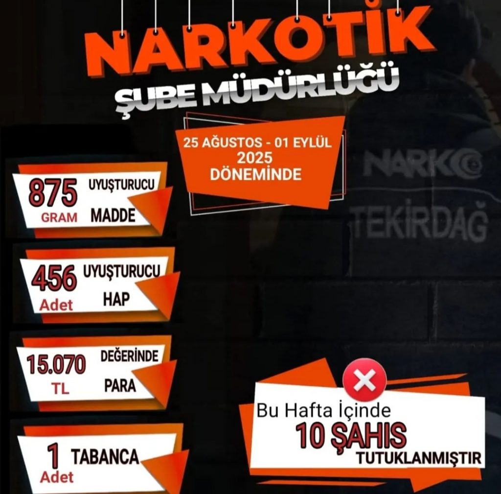 Tekirdağ İl Emniyet Müdürlüğü Narkotik Suçlarla Mücadele ekipleri, 25 Ağustos – 1 Eylül 2025 tarihleri arasında gerçekleştirdiği operasyonlarda sokak satıcılarına ağır darbe vurdu.Yapılan operasyonlarda;875 gram çeşitli uyuşturucu madde,456 adet uyuşturucu hap,1 adet ruhsatsız tabanca,15 bin 70 TL nakit para ele geçirildi.Öte yandan Çorlu’nun Hıdırağa (Kore) Mahallesi’nde hakkında 2 yıl 9 ay 10 gün kesinleşmiş hapis cezası bulunan “zehir taciri” Z.P. polis ekiplerince yakalandı.Operasyonlar kapsamında gözaltına alınan şüphelilerden 10 kişi çıkarıldıkları mahkemece tutuklanarak cezaevine gönderildi.Tekirdağ Emniyet Müdürlüğü’nden yapılan açıklamada, “Gençlerimizi zehirleyen sokak satıcılarından ve torbacılardan Tekirdağ’ımızı temizlemekte kararlıyız” denildi.